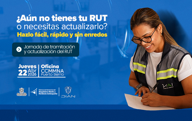 La Cámara de Comercio del Magdalena Medio y Nordeste Antioqueño, en articulación con la DIAN y la Alcaldía de Puerto Berrío, te invita a participar en la jornada de tramitación y actualización del RUT.